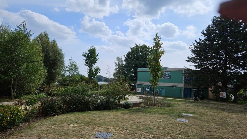 Block D occupies one of the most desirable ground floor sites on the estate, with the small amphitheatre of natural and artificial grass immediately beside it, and a view of the reservoirs subtly screened by greenery. The artificial estate football pitch will shortly replace the temporary green building in the view below.