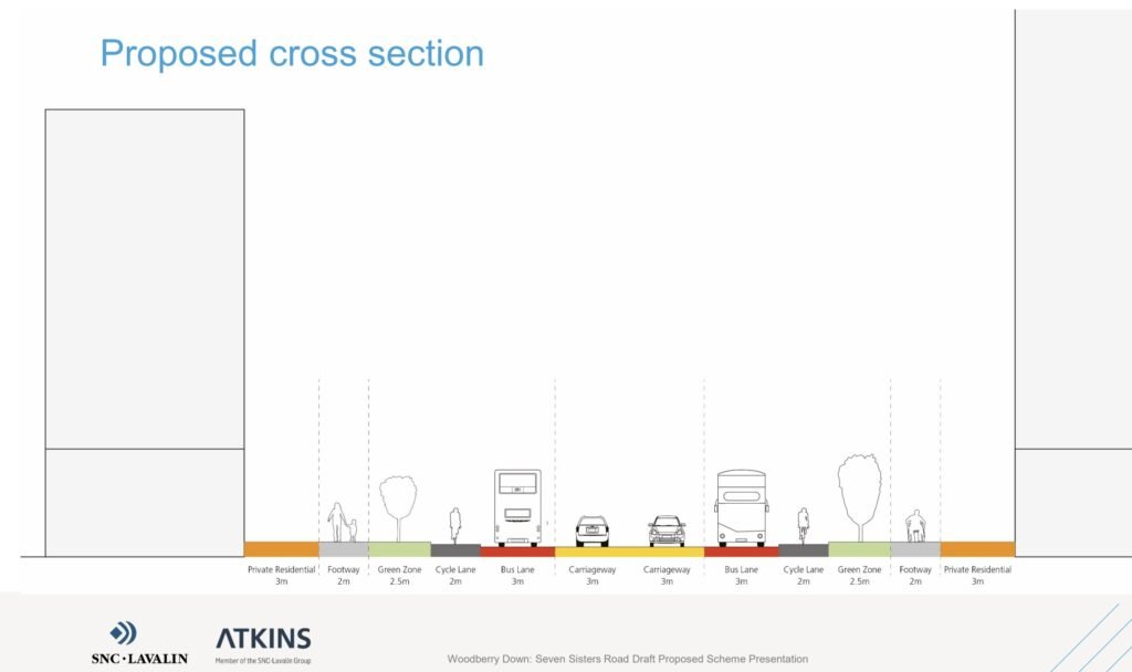 Looking at the lanes set out in these diagrams the cross section of the road is still very much like that set out in the SNC Lavalin Atkins proposal of 2018 https://staging.wdco.org.uk/wp-content/uploads/2024/09/SNC-Lavalin-Atkins-Seven-Sisters-Road-Scheme-July-2018.pdf