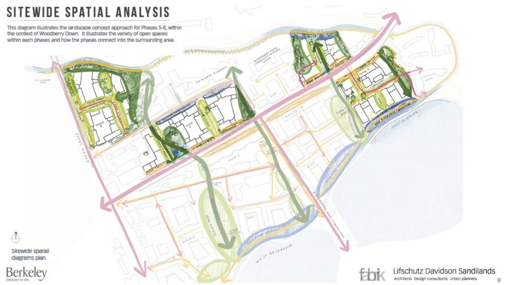The overall site of Woodberry Down is contained on three sides by the New River, and on the fourth, to the North by Green Lanes, and for the rest by the end of the old council buildings, or their modern replacements. You can see this in the image below which is taken from a Berkeley Homes presentation made to the WDCO board